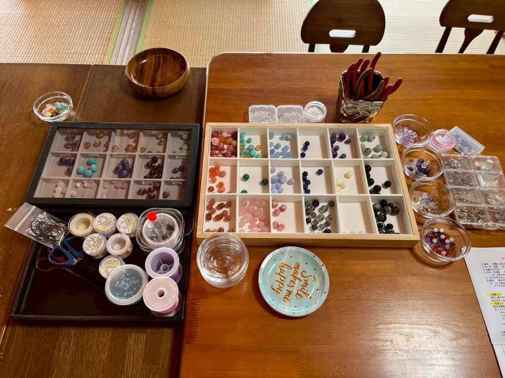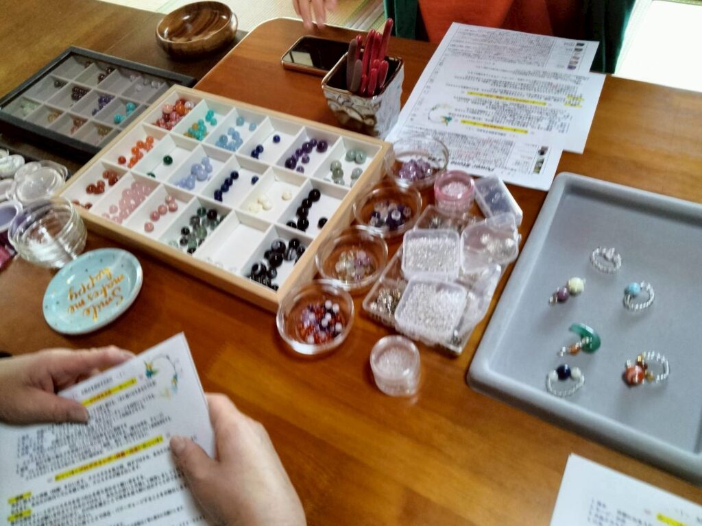 無限結が、今日は色とりどりの天然石でキラキラと輝く舞台に。ワークショップの様子をお届けします。