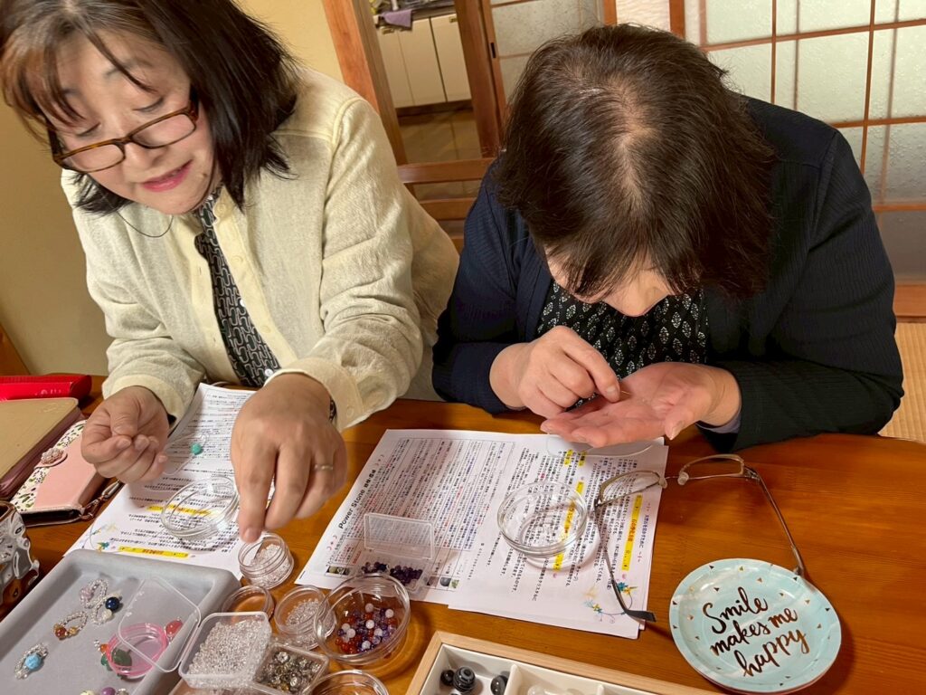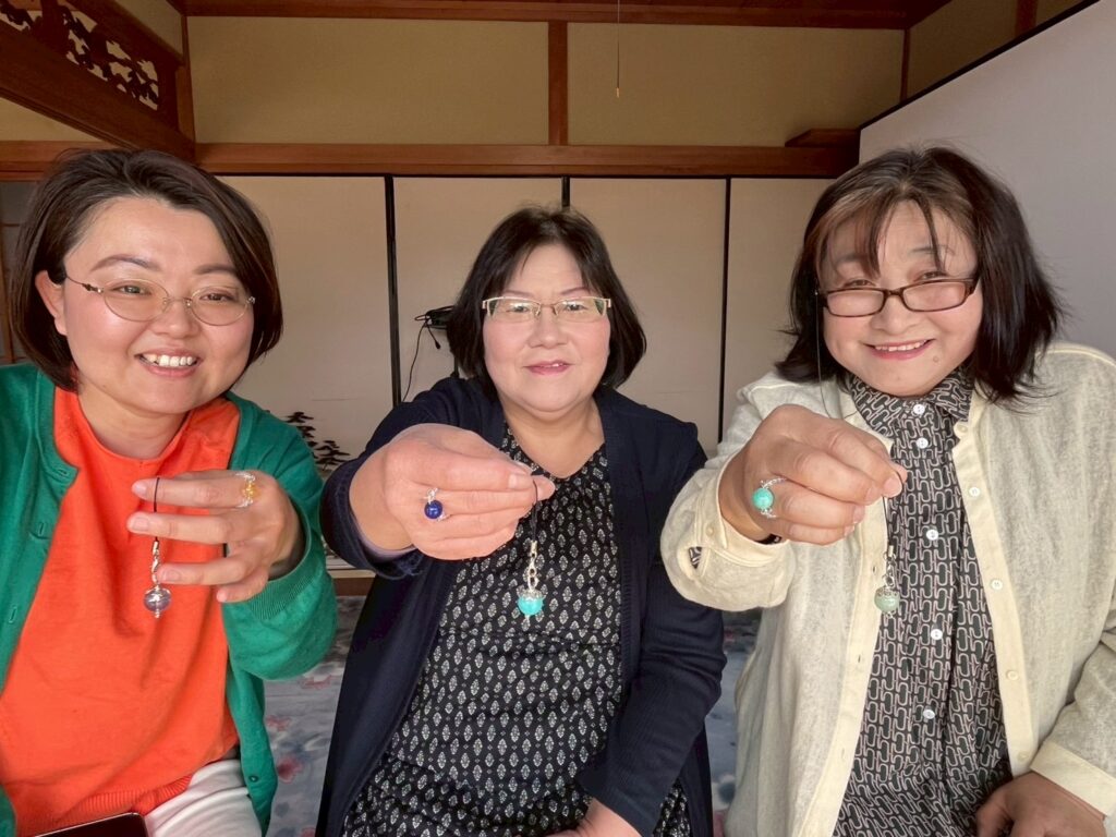 ところが、これがなかなかの強敵でした(笑)。 指輪に使う小さな石にゴムを通す繊細な作業。そして最後の結び目は、力を入れすぎれば切れそうだし、緩ければ解けてしまう……。その絶妙な加減に、皆さん全集中。
